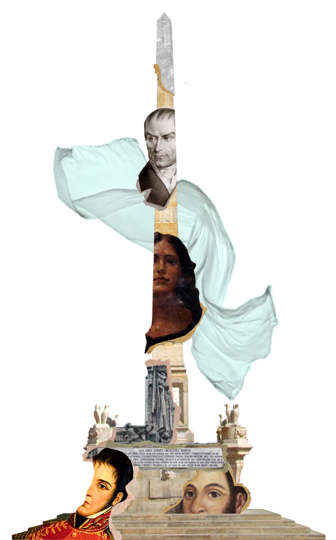 El obelisco es un símbolo de memoria y de poder. Se trata generalmente de un pilar muy alto, un único bloque macizo de piedra cuyas cuatro caras son todas iguales. Los primeros que se conocen son aquellos realizados como homenaje a Ra en el antiguo Egipto – el dios Sol, símbolo de poder de lo que une al dios Sol con el faraón. Con el tiempo, los romanos adoptaron esta forma celebrativa y la relación entre el símbolo y quien detenta el poder. Así, los usos van adquiriendo diferentes connotaciones y en este caso, el obelisco conmemora la presencia de los mártires con el proceso de independencia, origen de la Nación. De aquí la placa en mayúsculas: