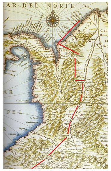A la llegada de los españoles, circulaba la leyenda del dorado. El 24 de enero de 1538 salió del puerto de San Sebastián de Urabá, la expedición de Juan de Vadillo. Fue la primera expedición que hizo la ruta entre Urabá y Perú por tierra, atravesando la cordillera occidental. Siguiendo las noticias que le dio el capitán Francisco César, así como la leyenda de El Dorado. La expedición se proponía descubrir y tomar posesión de minas y tierras ricas. ×