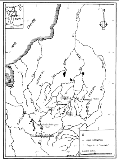 Hacia las primeras décadas del siglo XVII, la provincia de Antioquia se convirtió en uno de los núcleos económicos más importantes del Nuevo Reino de Granada, por la producción de oro extraído de las vetas del cerro de Buriticá, de los ríos Cauca y Nechí, al occidente y norte de la provincia. Entre tanto, se consolidó el distrito minero en Anserma, que se concentró en los yacimientos vetiformes ubicados en los cerros de Quiebralomo, Supía, Marmato, Pícara y Mapura.×